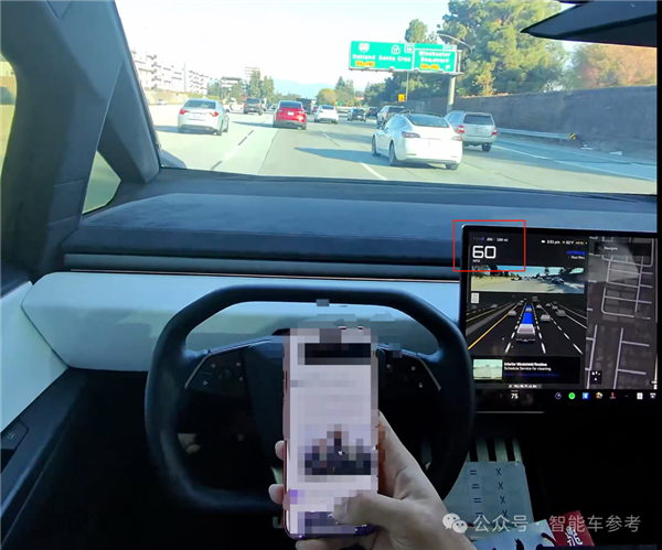 视频中他全程都在玩手机,放任车辆在车流中自由穿梭,车速最高时为60mph,换算成咱们熟悉的单位也就是时速96km。据他透露,后来在遇到一辆货车往自己车道上并线时,系统才提醒自己。